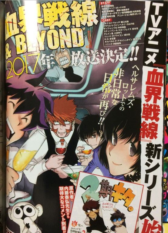 A edição de outono da revista Jump SQ.Crown, da Shueisha, revelou nesta terça-feira (29/11) que o Anime TV Kekkai Sensen (Blood Blockade Battlefront) ganhará uma segunda temporada em 2017.