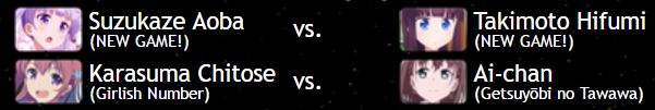 Na primeira, assim como aconteceu nos torneios sazonais de Inverno e Primavera onde duas personagens da mesma série (KonoSuba e Re: Zero, respectivamente), vamos ter um confronto entre duas personagens de New Game! que será entre Aoba Suzukawa vs Hifumi Takimoto. Já no outro confronto será o único dos torneios sazonais que será com personagem de animes diferentes, sendo Chitose Karasuma (Girlish Number) vs Ai-chan (Getsuyobi no Tawawa).