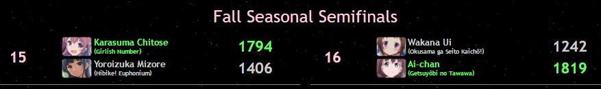 Além disso, tivemos a votação das semifinais do Torneio Sazonal da Temporada de Outono 2016. Em um dos confrontos, Chitose Karasuma (Girlish Number) venceu Mizore Yoroizuka (Hibike! Euphonium) e no outro confronto que incluiu duas personagens de animes de episódios curtos, Ai-chan (Getsuyobi no Tawawa) venceu Ui Wakana (Okusama ga Seito Kaichou!).