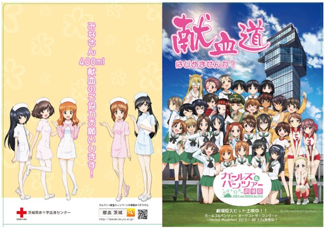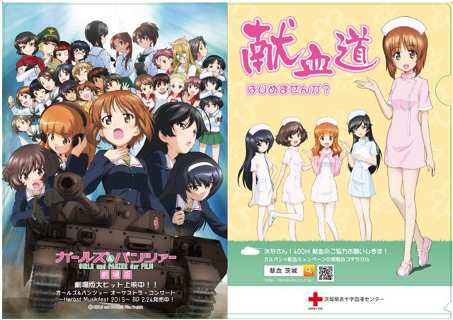 Esta é a sexta vez que Girls Und Panzer está colaborando com a unidade de sangue de Ibaraki. Cartazes e itens promocionais deste ano perguntam aos doadores de sangue em potencial, “Você não vai ir doar sangue?”.