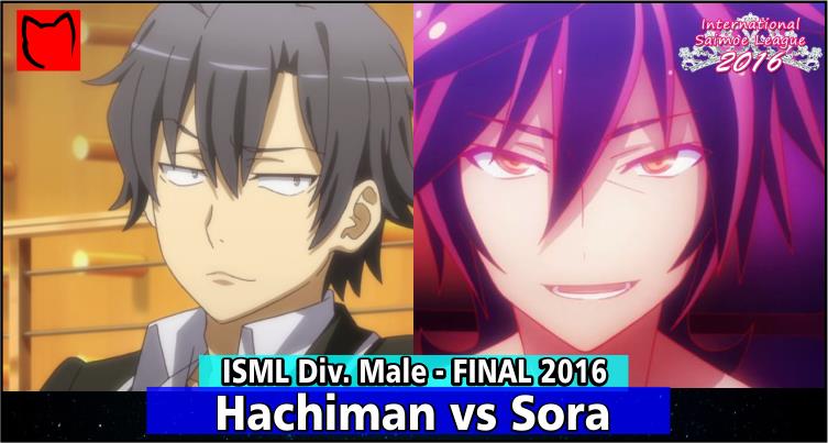 Já na final masculina, chegaram os dois personagens de melhores campanhas durante toda a competição. Hachiman Hikigaya de Oregairu enfrentou Sora e, o personagem de No Game No Life provou que gosta de um jogo recebendo o maior número de votos dos fãs de todo o mundo: