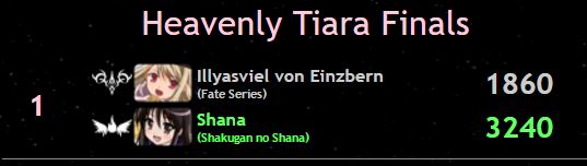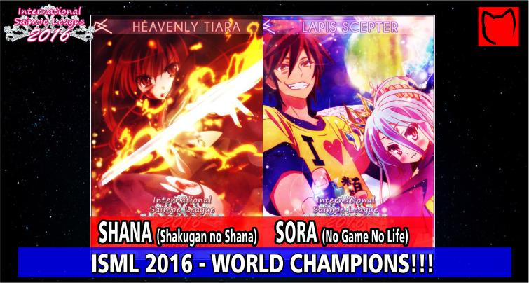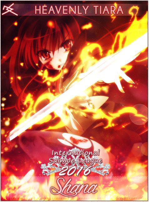 - International Saimoe League 2016 – Heavenly Tiara: Shana (Shakugan no Shana); Lapis Scepter: Sora (No Game No Life).