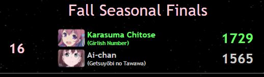 Também tivemos o Torneio Sazonal da Temporada de Outono e, finalmente tivemos uma final com personagens de animes diferentes. O surpreendente foi que o anime Getsuyobi no Tawawa, com episódios curtos de 5 minutos, levou a personagem Ai-chan até a final, mas os fãs acabaram votando em maioria na divertida e um pouco cínica protagonista de Girlish Number, Chitose Karasuma: