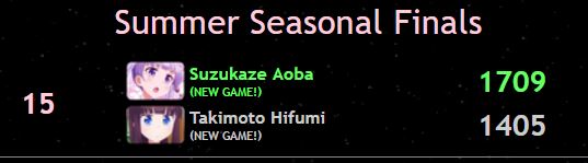 Após os torneios das Temporadas de Inverno e Primavera serem decididos por duas personagens do mesmo anime, no Torneio do Verão não foi diferente. Na votação com personagens amorzinhos de New Game!, Aoba venceu Hifumi: