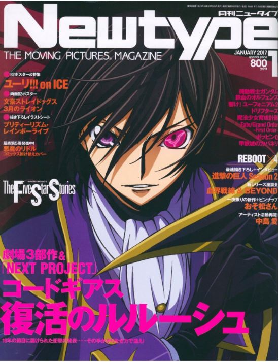 A edição de Janeiro 2017 da revista Newtype trás além do ranking, paginas ilustradas, informações e posters de séries de animes como Code Geass, Pretty Cure, Pretty Rhythm Rainbow Live, D.Gray Man, Kantai Collection, Kimi no Na Wa, Bakemonogatari, Macross Delta, Bubuki Buranki, Gundam, Five Star Stories, Re:Zero, Amanchu!, New Game!, Sword Art Online, Drifters, Hibike! Euphonium, Brave Series, Strike Witches, Gundam – Iron Blooded Orphans, Touken Ranbu, Yuri!!! on Ice, Bungou Stray Dogs, Gochuumon wa Usagi Desu Ka?, Attack on Titan, Sangatsu no Lion, entre outros.