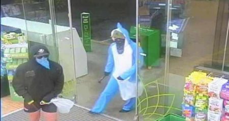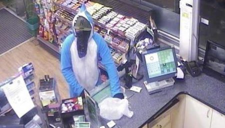 Um homem vestido em um kigurumi de tubarão azul e branco e uma bandana preta era uma das duas pessoas que roubaram um posto de gasolina perto de Christchurch – Nova Zelândia, durante a noite.