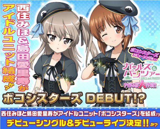 As personagens Alice Shimada e Maho Nishizumi, de Girls Und Panzer estão estreando como grupo de idols “Boko Sisters”. As meninas estão indo com tudo, com um evento de uma semana, tanques, Single-CD e muito mais. [ Link ]