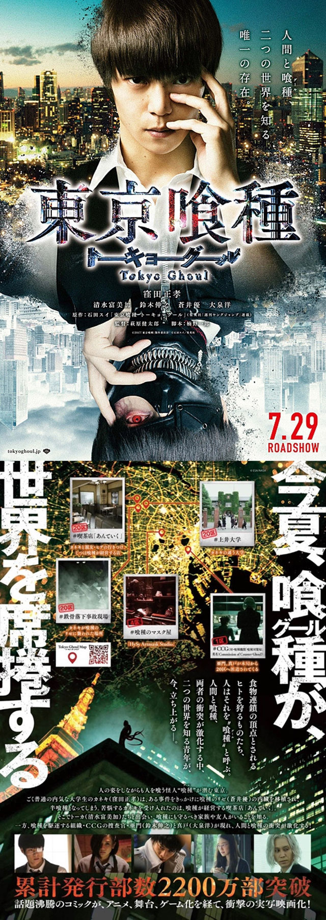 O site oficial da produção do Live-Actiond e Tokyo Ghoul foi divulgada nesta madrugada, nela podemos notar os dois posters agora juntos e de forma espelhada e logo abaixo um mapa das localidades que já conhecemos no anime e mangá, não é muita coisa, mas esse filme parece que irá no minimo ser bacana. Já estamos noa guardo de um noto trailer completo! =D