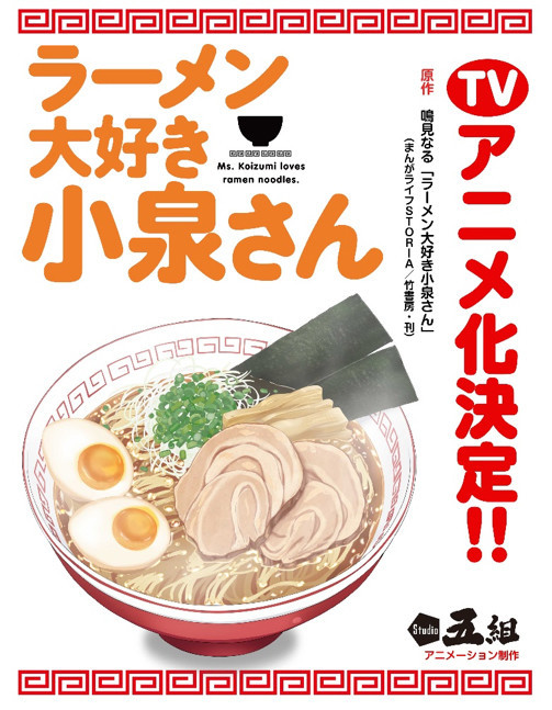 O site oficial para a adaptação em Anime TV do manga de Naru Narumi, Ramen Daisuki Koizumi-san (Ms. Koizumi loves ramen noodles) revelou nesta sexta-feira (26/05) a equipe de produção e um visual para o anime: