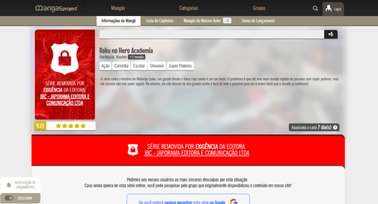 A quase duas semanas a Editora Panini foi pra cima desses sites, fazendo com que diversos títulos fossem retirados do ar e neste ultimo final de semana a Editora JBC iniciou sua investida, solicitando a retirada dos quadrinhos licenciados por ela.
