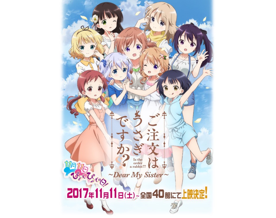 Durante o evento “Manga Time Kirara Festa” realizado neste domingo (25/06), foi revelado que o episódio especial de de Gochuumon wa Usagi Desu Ka?? (Is the order a rabbit??), intitulado Gochuumon wa Usagi Desu ka?? ~Dear My Sister~, será lançado em 40 cinemas no Japão no dia 11 de Novembro de 2017. No mesmo dia, o CD com as canções temas do episódio será colocado à venda. Além disso, um novo CD de canções das personagem será lançado em Outubro.