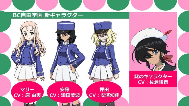 Foram reveladas neste sábado (07/10) novas informações sobre o projeto de filme em 6 partes Girls Und Panzer das Finale. Durante uma transmissão ao vivo, foram revelados mais 4 novas personagens para a sequência. As personagens são do BC Freedom High School e suas respectivas seiyuus: