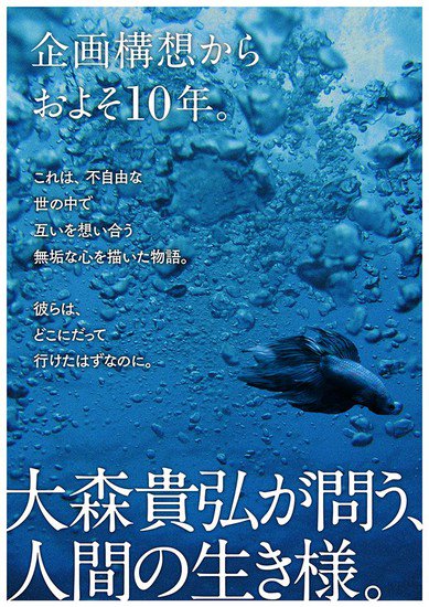 A imagem acima diz: “Há cerca de 10 anos de fabricação. Esta é uma história sobre os corações puros com sentimentos mútuos em uma sociedade destituída. Mesmo que eles deveriam ser capazes de ir a lugar algum. Takahiro Ōmori examina o modo de vida da humanidade”.