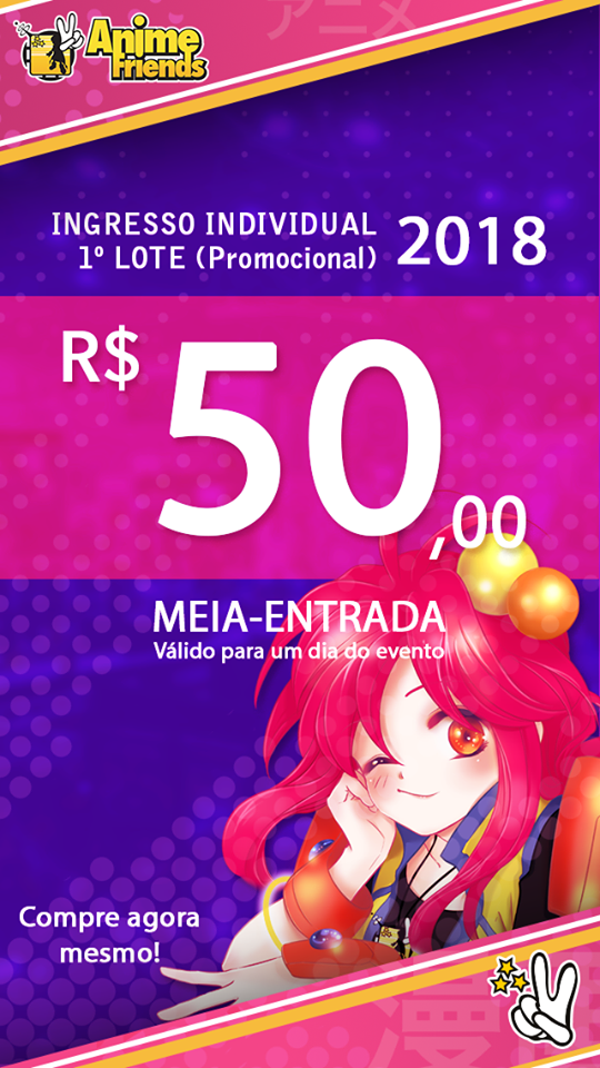 O evento mais esperado de julho liberou nesta sexta-feira, 02, a venda de ingressos do primeiro lote. O Anime Friends 2018 acontecerá nos dias 06, 07, 08 e 09 de julho e os fãs já podem adquirir seus ingressos com preços promocionais.