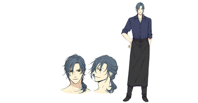 Takuya Satō como Tsubasa Hayakawa, que trabalha no Café du Vane. A cor da imagem é verde.