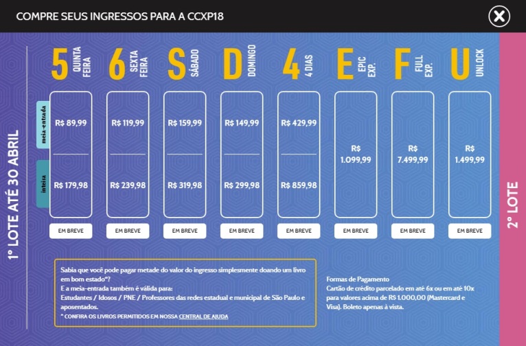 A CCXP – Comic Con Experience, maior comic con do planeta após reunir 227 mil pessoas em 2017 e bater mais uma vez o recorde de público em comic cons no mundo, realiza sua quinta edição entre os dias 06 e 09 de dezembro no São Paulo Expo, e dá início à venda de ingressos no próximo dia05 de abril.