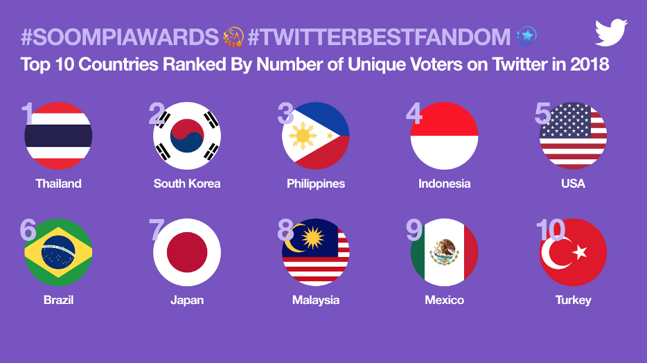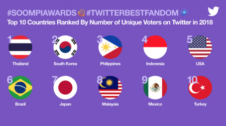 A Tailândia foi o país com o maior número de usuários que participaram da votação do “Melhor Fandom do Twitter”, seguida por Coréia do Sul, Filipinas, Indonésia, Estados Unidos, Brasil, Japão, Malásia, México e Turquia. O número de eleitores únicos no Twitter aumentou em 17% em relação ao ano Anterior, fazendo de 2018 a temporada de votação mais popular do Soompi Awards no Twitter.