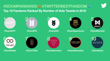 Em 2018, o Twitter apoiou pela primeira vez oficialmente o #SoompiAwards, premiação anual do @soompi, comunidade focada em assuntos relacionados à cultura pop coreana, que elege os principais nomes do K-pop em diversas categorias. A votação para o “Melhor Fandom do Twitter”, em que fãs Tweetaram com a hashtag #TwitterBestFandom para escolher o seu grupo de música pop coreana favorito, gerou quase 42 milhões de Tweets em todo o mundo durante dois períodos de 24 horas. Os fãs brasileiros de k-pop tiveram uma participação de destaque na votação, colocando o Brasil como o sexto país em número de usuários votantes únicos, atrás apenas países da Ásia e dos Estados Unidos.