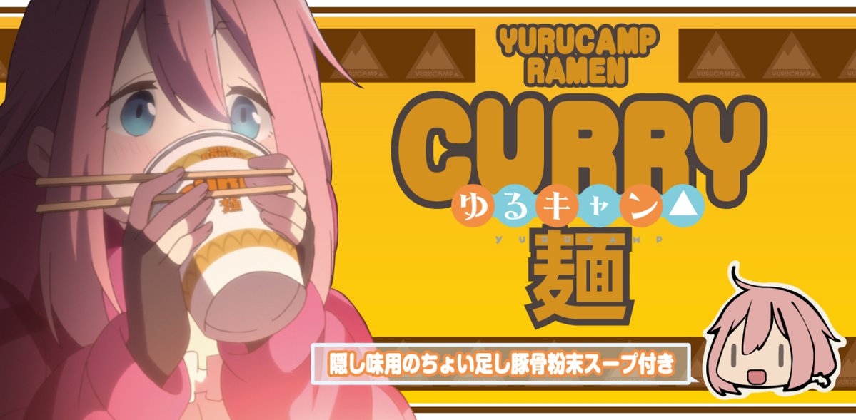 Você que assistiu o anime TV Yurucamp (Yurukyan△ ou Laid-Back Camp Δ), se lembra da cena acima que Rin ajuda a perdida Nadeshiko e lhe dá um ramen de curry e viu ela come-lo com tanto gosto? Pois é, agora os fãs poderão viver este momento com os macarrões instantâneos de curry inspirados no anime.