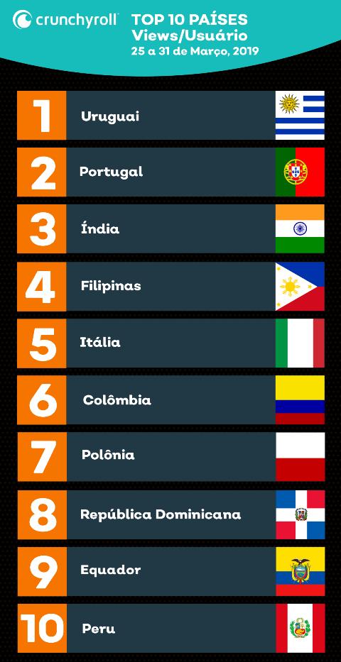 A equipe da Crunchyroll tem o orgulho de servir fãs des anime em mais de 200 países e territórios pelo mundo todo. Confira o ranking de países com o maior número de views por assinante, para o período entre 25 e 31 de março: