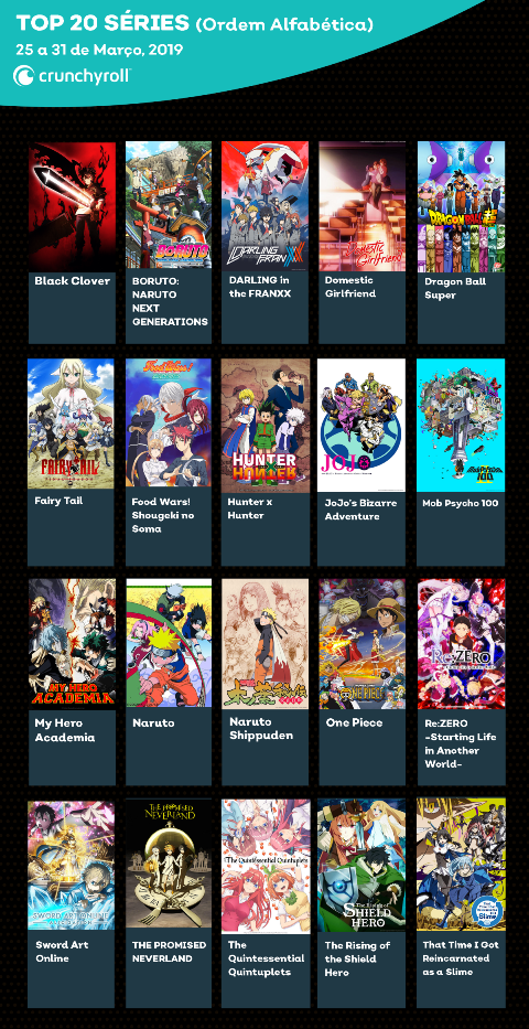 Em média, os usuários da comunidade da Crunchyroll passam aproximadamente uma hora por dia assistindo seus títulos favoritos. Abaixo, divulgamos a lista dos 20 títulos mais assistidos, em número de views no período entre 25 e 31 de março. Note que a lista está organizada em ordem alfabética.