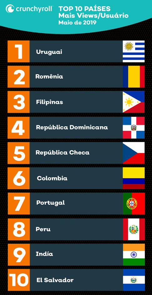 A equipe da Crunchyroll tem o orgulho de servir fãs de anime em mais de 200 países e territórios pelo mundo todo. Confira o ranking de países com o maior número de views por assinante, para o mês de maio: