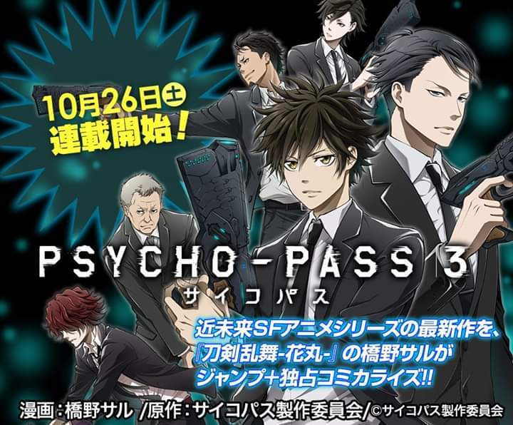 O aplicativo Shonen Jump+ da Shueisha revelou na segunda-feira (30/09) que Psycho-Pass 3, a terceira temporada do Anime TV da franquia Psycho-Pass vai ter uma adaptação para mangá que vai ser lançado no app em 26 de Outubro. Saru Hoshino (mangá Psycho-Pass 2) vai desenhar o mangá.