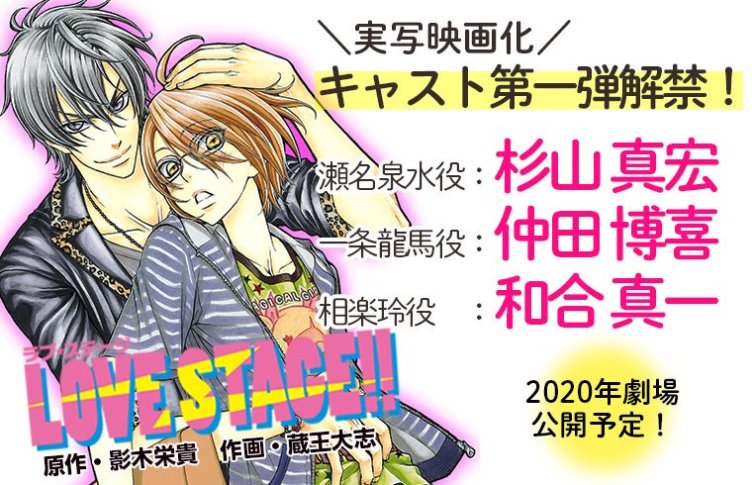 A conta no twitter do departamento editorial da revista CIEL da Kadokawa revelou nesta quarta-feira (02/10) três membros para o elenco da adaptação em filme live-action para os cinemas do mangá yaoi de Taishi Zaou e Eiki Eiki, Love Stage!! Mahiro Sugiyama interpretará Izumi Sena, Hiroki Nakada interpretará Ryōma Ichijō e Shinichi Wagō interpretará Rei Sagara. O tweet também revelou que o filme será lançado nos cinemas do Japão no decorrer de 2020.
