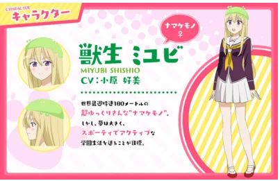 Konomi Kohara como Miyubi Shisho, a garota mais preguiçosa do mundo (180 metros / 600 pés por hora)