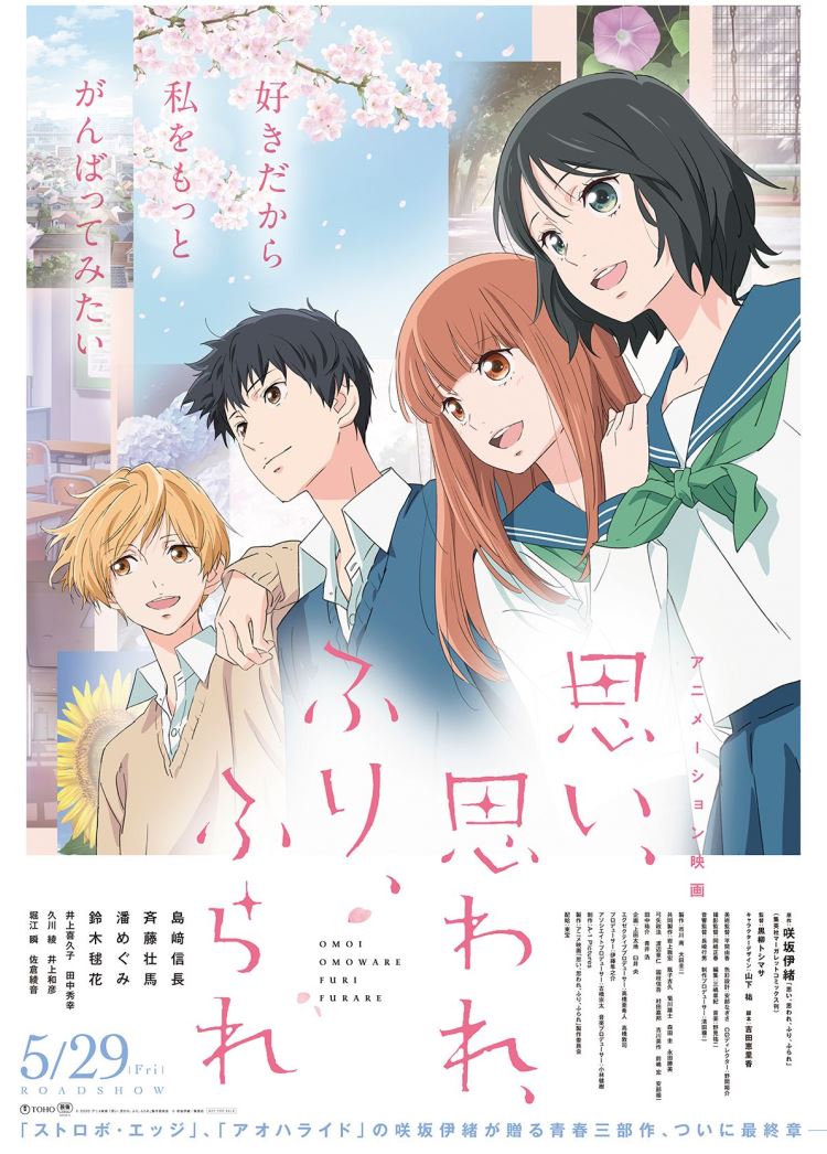 O site oficial para o filme anime baseado no mangá de Io Sakisaka, ‘Omoi, Omoware, Furi, Furare‘, divulgou os membros do elenco para os principais personagens dos pais e colegas na quinta-feira (12/03). Ele também publicou um novo visual dos quatro personagens principais “cheios de esperança, com o brilho da juventude e a leve amargura do romance”. O slogan no cartaz diz: “Quero me esforçar ainda mais porque gosto de você”.
