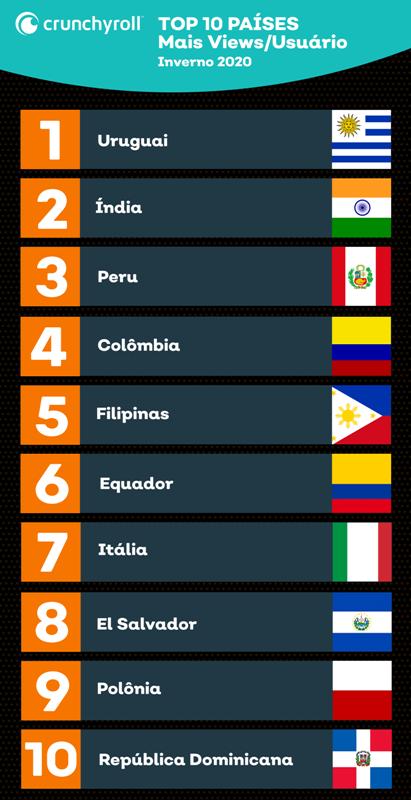 Nós temos o orgulho de servir a fãs de anime em mais de 200 países e territórios! Confira abaixo a lista de países mais ativos em nossa plataforma (maior número médio de views por usuário durante o 1º trimestre de 2020):