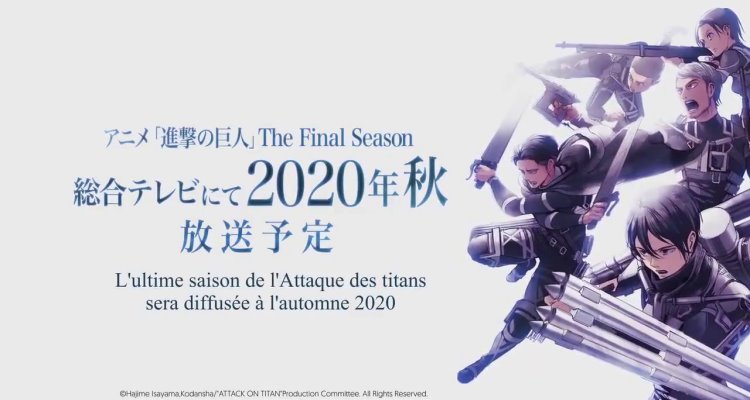 A empresa de streaming Wakamin, subsidiária da Aniplex, anunciou neste domingo (03/05) através de seu twitter que a 4ª temporada da adaptação em anime TV baseada na série de mangá de Hajime Isayama, Attack on Titan (Shingeki no Kyojin) vai estrear nas TVs japonesas na Temporada de Outono 2020 (entre Outubro à Dezembro).