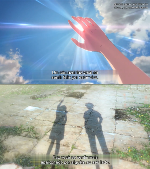 Ele tem algo a se agarrar e durante o 1h47min a gente percebe todo o desenvolvimento dos personagens mas apesar disso o background do protagonista foi um pouco deixado de lado até um certo momento e isso fica óbvio no filme, porém não fique pensando que isso estraga, de jeito nenhum. Nossa quem sou eu pra dizer que esse pequeno detalhe estraga todo o filme, não. Apenas fica a sensação de que faltou algo a mais no protagonista e diferente dele a vida da Hina praticamente fica escancarada pra gente (no bom sentido), criamos empatia por ela e isso também vem do fato que o filme todo é em volta dela.