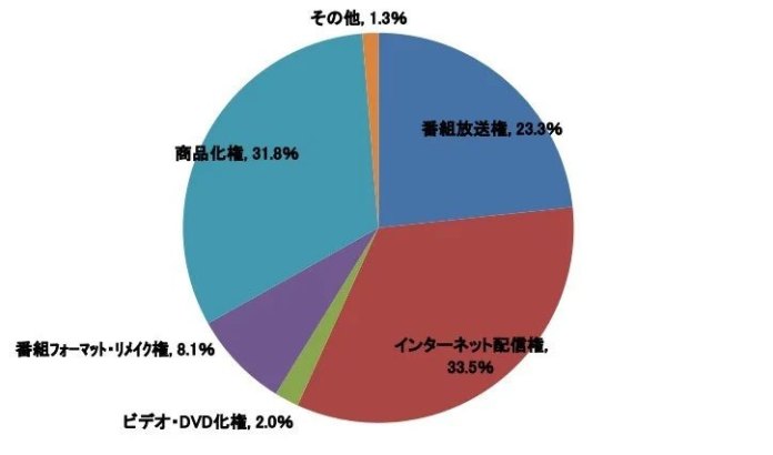 Os direitos de streaming na Internet compreendem a maior parte do mercado com 33,5%, seguidos pelos direitos de merchandising com 31,8%, direitos de transmissão com 23,3%, direitos de remake com 8,1%, direitos de vídeo e DVD com 2,0% e outras receitas com 1,3%.