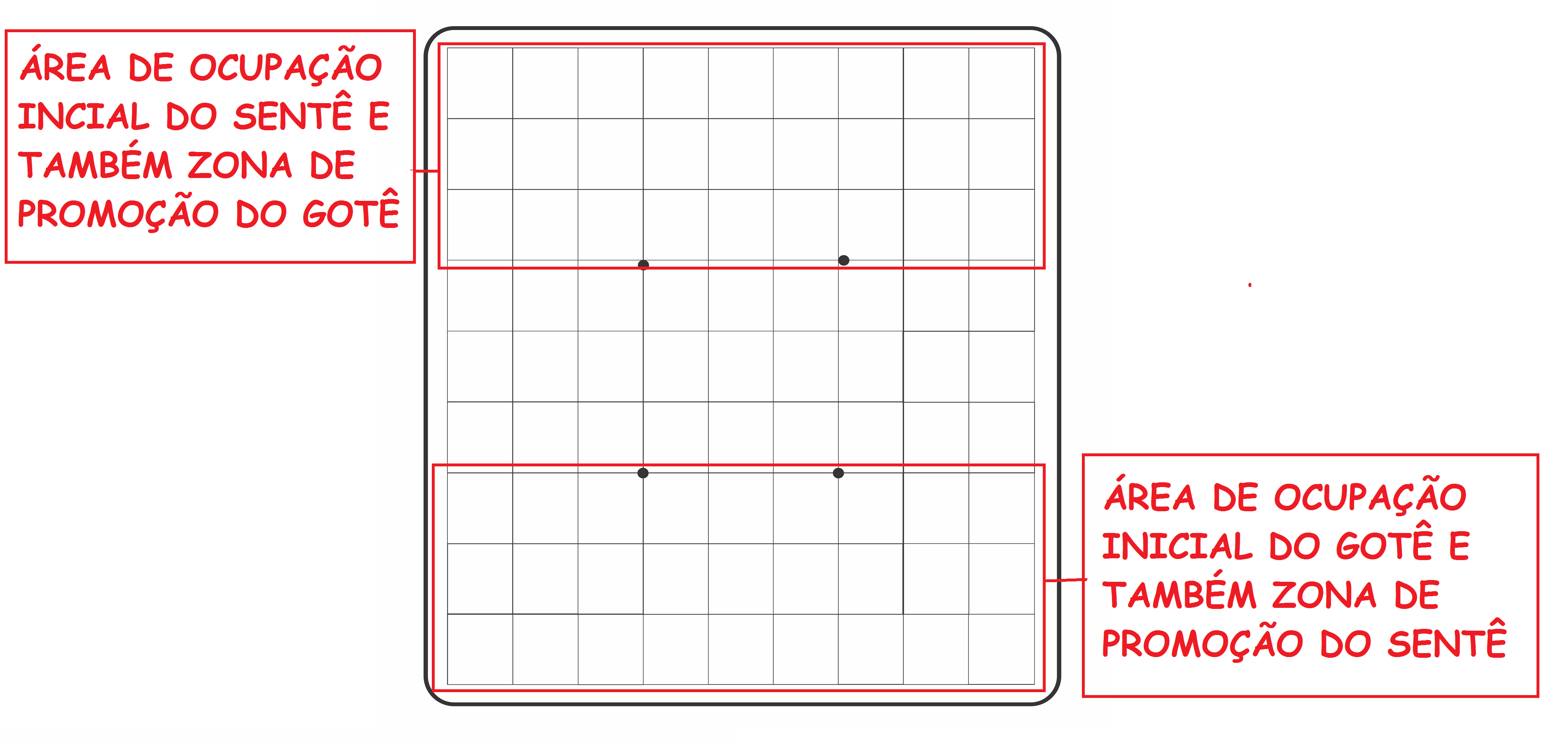 Como já expliquei em artigos anteriores, as três primeiras fileiras são a zona de colocação das peças iniciais do Sentê assim como as três últimas são a zona de colocação de peças do Gotê. No entanto, a área do Gotê também serve para o Sentêpromover as suas peças. E o oposto também é válido.