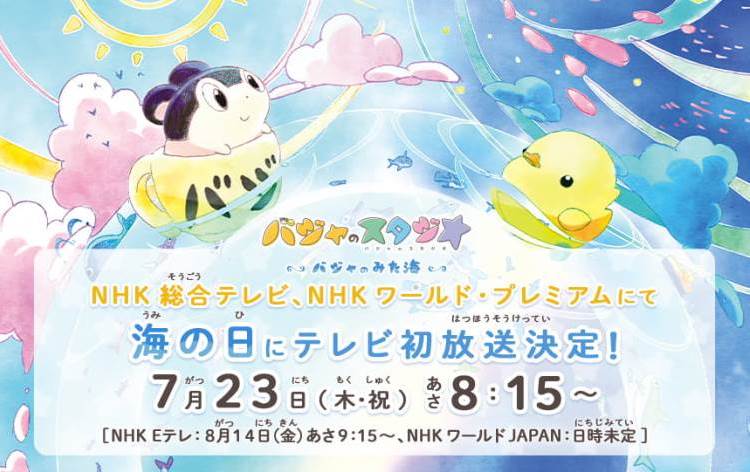 A emissora de televisão NHK anunciou que transmitirá a série Baja no Studio: Baja no Mita Umi (Baja’s Studio – Baja and the Sea), produzida pelos estúdios da Kyoto Animation, através dos canais NHK General e NHK World Premium a partir do próximo dia 23 de Julho. O anime vai ser reprisado na NHK-E em 14 de Agosto com transmissão mundial pela NHK World com legendas em inglês.
