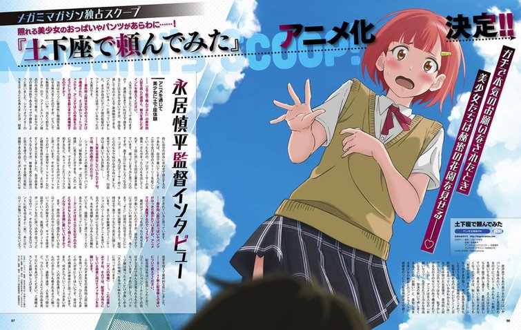 A livraria varejista HMV apresentou em uma atualização a capa da edição de Setembro 2020 da revista Megami Magazine da Gakken Plus com a informação de que o mangá adulto de Kazuki Funatsu, Dogeza de Tanondemita (I Tried Asking While Kowtowing) está inspirando uma adaptação em anime (ainda sem saber se será uma série de TV, filme, OVA ou algum outro projeto). A revista vai ser lançada nas bandas e livrarias do Japão nesta quinta-feira.