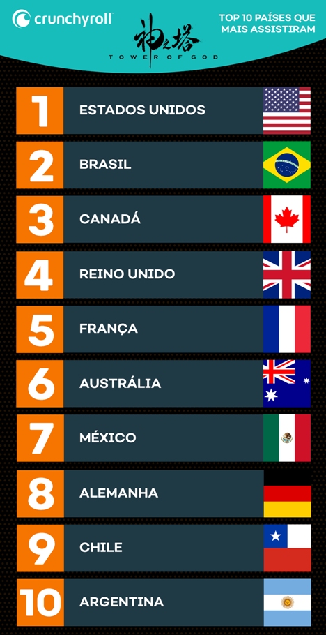 Tower of God foi o grande sucesso da temporada passada, aparecendo em diversos Top 10 pelo mundo todo. O Crunchyroll Original foi particularmente popular no Brasil, que foi o segundo país que mais assistiu a série, depois do Estados Unidos. Confira abaixo o ranking dos países que mais assistiram Tower of God na temporada passada: