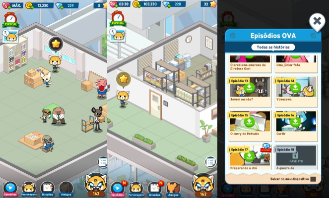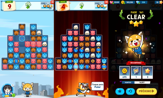 É uma espécie de candy crush sofisticado (e viciante pra quem adora a série) com as bombas sendo os personagens, os poderes serem ativados também por personagens da série e ainda, ao final, a Retsuko cantando seu famoso death metal.
