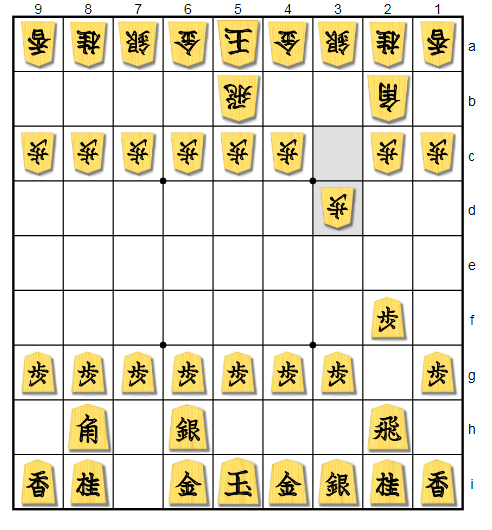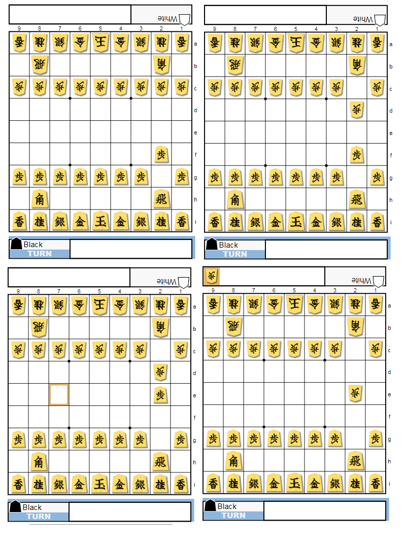 1.☗P-2f 2.☖R-5b 3.☗S-6h 4.☖P-3d