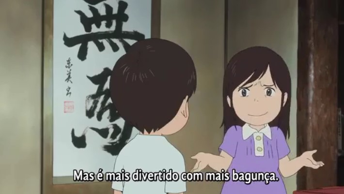 Você sabe do que o filme está falando e com isso percebemos ou no meu caso que cada viagem que é feita o protagonista amadurece um pouco e sim eu sei, o Kun-chan é um personagem que chora, ele faz birra e GRITA como qualquer criança da idade dele e isso se torna um pouco irritante ao longo do filme mas conforme um tempo vai passando ele começa entender tudo a sua volta e assim vai resgatando sua conexão com os pais, onde também ele aceita o seu papel de irmão mais velho de Mirai. Entretanto acredito eu que em qualquer ambiente familiar, Mirai como exemplo se esforça para nos mostrar que um menor desvio de atenção em um dos membros pode desencadear uma ruptura na família e que também pequenos detalhes fazem toda diferença hoje ou amanhã, quem sabe no futuro.