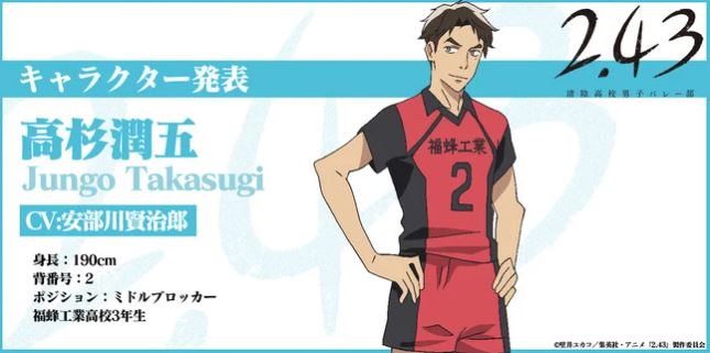 A conta oficial no Twitter para a adaptação em anime da série de light-novels de Yukako Kabei, 2.43: Seiin Koukou Danshi Volley-bu (Seiin High School Boys Volleyball Club) divulgou nesta semana um novo membro para o elenco. Kenjiro Abekawa vai dar voz à Jungo Takasugi, um aluno do terceiro ano da Seiin High School e bloqueador médio no clube de vôlei masculino.