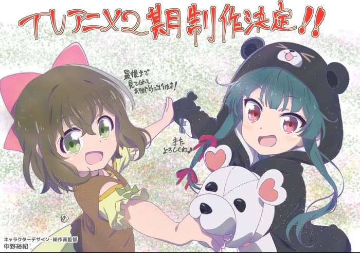 O site oficial para a adaptação em anime TV baseado na série de light-novels de Kumanano e 029, Kuma Kuma Kuma Bear divulgou nesta já quinta-feira (24/12) no Japão que o anime vai ter uma segunda temporada.