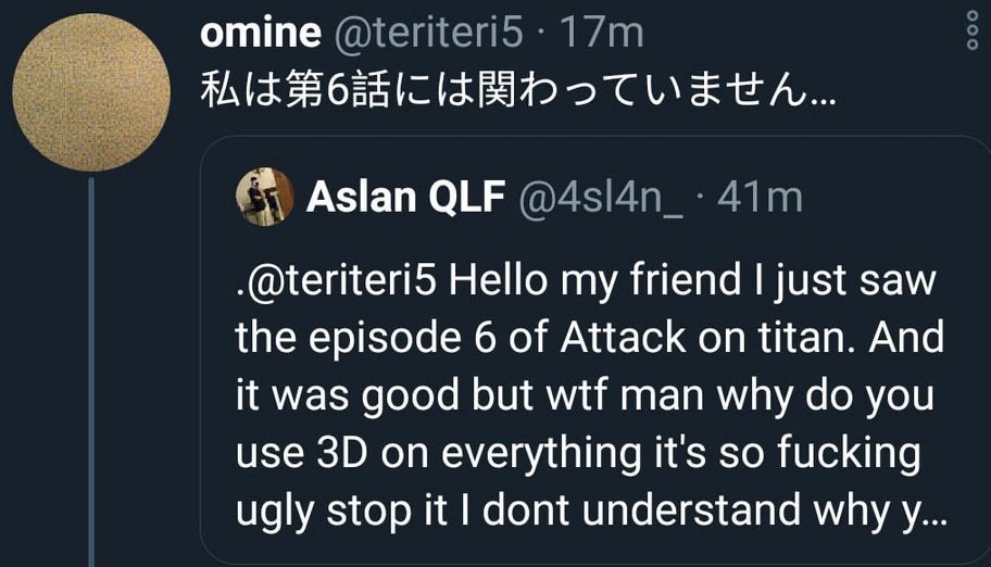 .@teriteri5 Hello my friend I just saw the episode 6 of Attack on titan. And it was good but wtf man why do you use 3D on everything it’s so fucking ugly stop it I dont understand why you are keeping this shit. I let you pass for this one but next time I won’t be that friendly.