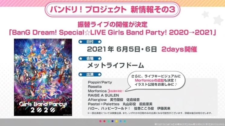 O especial também anunciou que os shows “BanG Dream! Special☆Live Girls Band Party! 2020”, que foram adiados para prevenir a propagação da nova doença Coronavírus COVID-19, agora ocorrerão nos dias 5 e 6 de Junho no Saitama’s MetLife Local Dome com o novo nome “BanG Dream! Special ☆ Live Girls Band Party! 2020 -> 2021”.