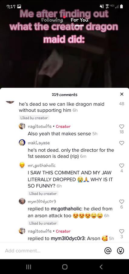 Uma cominidade de usuários na rede social TikTok celebraram o ataque ao edificio nº1 da Kyoto Animation em Julho de 2019, que resultou na morte de 36 pessoas e ferindo outras 33. Entre as vítimas estava o diretor da primeira temporada de Kobayashi-san Chi no Maid Dragon (Miss Kobayashi’s Dragon Maid), Yasuhiro Takemoto.