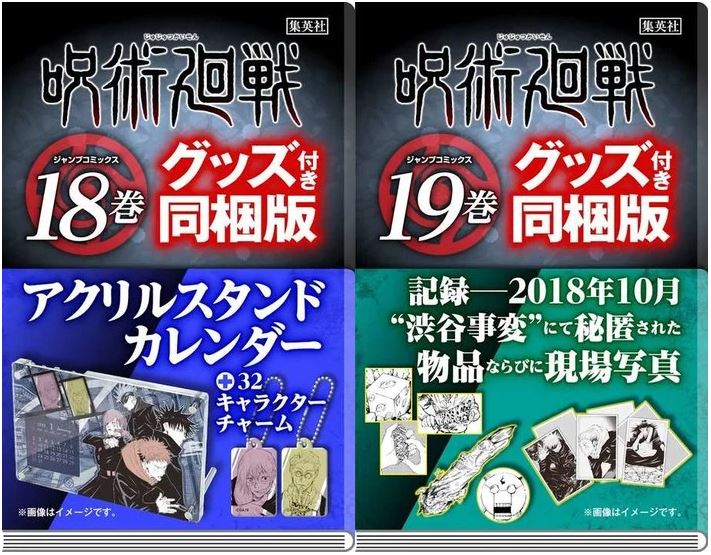 Além disso, a Shueisha revelou que o 18º volume do mangá (lançado em 25 de Dezembro) e o 19º volume (lançado em 4 de Abril de 2022) terão uma edição que reunirá mercadorias. O 18º volume incluirá um calendário de suporte de acrílico com encantos de 32 caracteres. O 19º volume reunirá cinco objetos do arco Incidente Shibuya do mangá e uma série de “fotos na cena” tiradas de painéis do mangá.