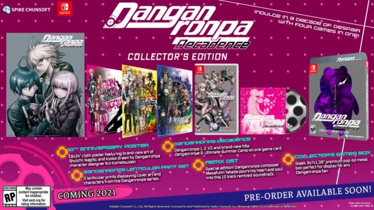 A Nintendo anunciou durante seu painél Nintendo Direct E3 2021 nesta terça-feira (15/06) que a Spike Chunsoft vai lançar a coletânea de games Danganronpa Decadence como um exclusivo físico no Nintendo Switch ainda este ano. A coleção incluirá os três jogos principais da série: Danganronpa: Trigger Happy Havoc Anniversary Edition, Danganronpa 2: Goodbye Despair Anniversary Edition e Danganronpa V3: Killing Harmony Anniversary Edition. O jogo irá e também incluirá o novo Danganronpa S: Ultimate Summer Camp, uma versão expandida do jogo bônus Danganronpa V3: Killing Harmony com novas cenas e interação. Todos os quatro jogos também terão lançamentos digitais separados na Nintendo eShop.