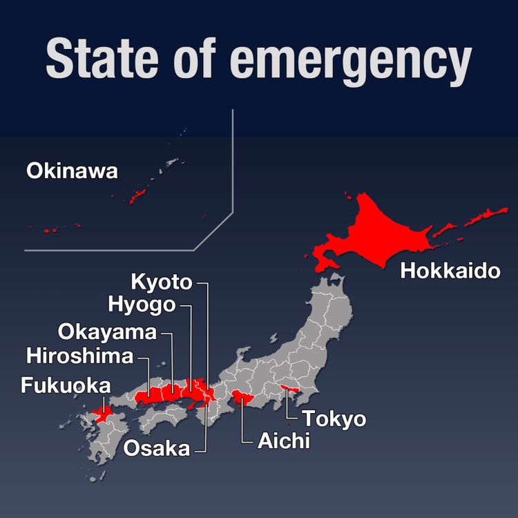 O governo japonês declarou Estado de Emergência nas prefeituras de Tóquio, Osaka, Kyoto e Hyogo em 23 de Abril. Este último estado de emergência foi originalmente previsto para suspender em 11 de Maio. O estado de emergência tinha como objetivo reduzir a quantidade de viagens durante o feriados da Golden Week do país no início de Maio. O governo japonês então estendeu o estado de emergência até 31 de Maio e acrescentou as prefeituras de Aichi e Fukuoka desde 12 de Maio. O governo então acrescentou Hokkaido, Okayama e Hiroshima em 16 de Maio. O estado de emergência foi extendido até 20 de Junho.