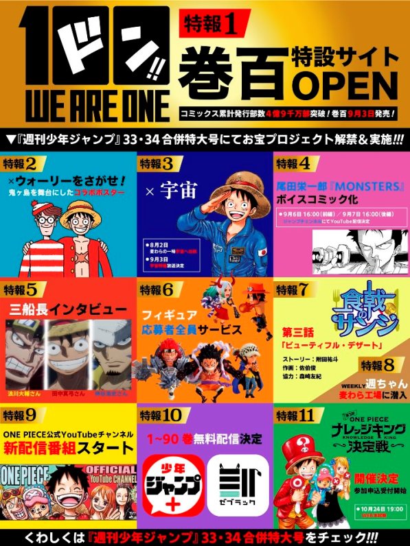 O mangá comemora seu 100º volume, que chega às lojas no dia 3 de Setembro, com diversos projetos. Um é o Projeto Kibo Discover, uma colaboração entre a editora de One Piece, Shueisha, a Japan Aerospace Exploration Agency (JAXA) e a produtora interativa Bascule. Este projeto vai desafiar as pessoas a espalharem esperança em todo o mundo, aventurando-se no espaço (Kibō ou “esperança” é o nome de um módulo japonês da Estação Espacial Internacional, bem como de um sistema de comunicação de vídeo entre a ISS e a Terra).